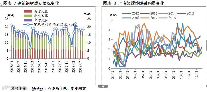 中期看,钢材需求下行概率大。土地溢价率回落,商品房销售增速大幅放缓预示着地产行业供需形势恶化。尽管政策对基建投资的支持力度加大,但考虑到基建投资项目周期较长,且11月份之后由北向南将逐步进入施工淡季,预计短期难以有明显回升。消费数据的回落叠加中美贸易战影响也将会对制造业的回升形成压制。
