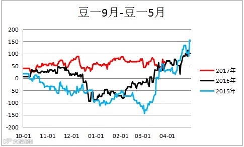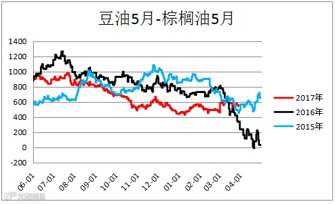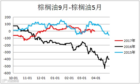 棕榈油跨期价差(P1809 – P1805)区间震荡。豆油跨期价差(Y1809– Y1805)小幅上行。
