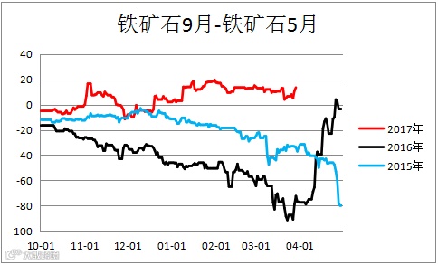 铁矿石跨期价差(I1809 – I1805)震荡,建议观望。