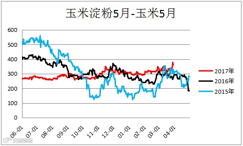 玉米淀粉玉米价差(CS1805 – C1805)小幅上行,建议观望。