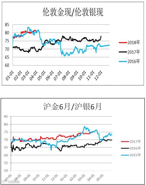 伦敦金银价比,沪金沪银价比(AU1806 / AG1806)区间震荡,未来行情有待观望。