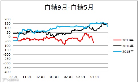 白糖跨期价差(SR1809– SR1805)震荡下行,建议观望。