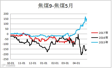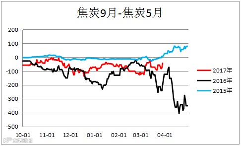 焦煤跨期价差(JM1809 – JM1805)震荡偏弱,焦炭跨期价差(J1809 – J1805)震荡,建议观望。