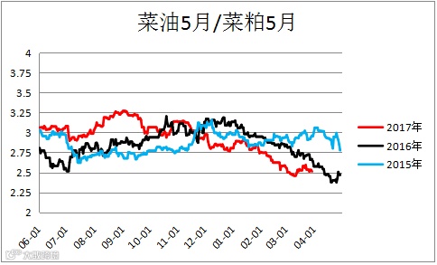 油粕比(Y1805/ M1805, OI1805 / RM1805)震荡,市场整体上呈现外强内弱,粕强油弱的格局,油脂基本面压力始终没有得到有效缓解,建议进行买粕抛油的套利操作。