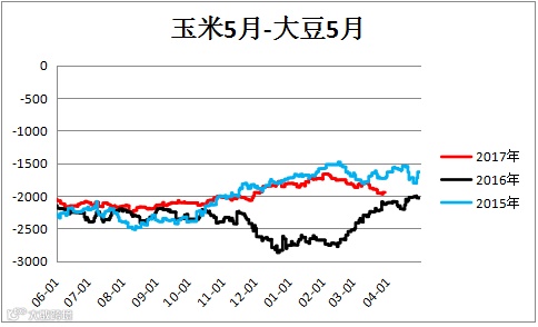玉米大豆价差(C05M-A05M)震荡下行,建议观望。