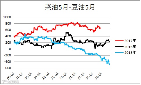菜油棕榈油价差(OI1805 – P1805),菜油豆油(OI1805 – Y1805)价差震荡,建议观望。