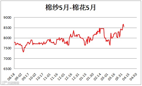 棉纱棉花价差(CY05M-CF05M)震荡上行,未来行情有待观望。