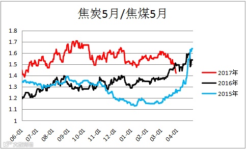 焦炭焦煤价比(J1805/ JM1805)震荡偏弱,建议观望。