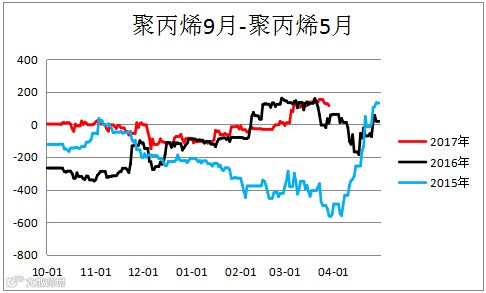 聚丙烯跨期价差(PP1809 – PP1805)震荡偏弱。