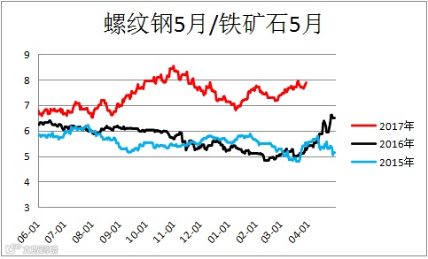 3、 螺纹铁矿石比价震荡偏强。采暖限产结束后,高炉开工率提高,复产逻辑恢复;同时钢厂原料库存较低,建议进行多铁矿空螺纹的套利操作。