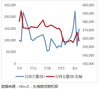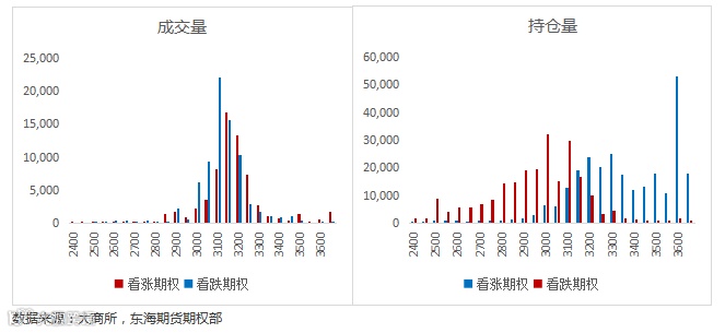 一般经验认为缴纳保证金的期权卖方属于资金优势者,通过分析卖方的持仓行权价来分析大资金者倾向认为的压力位和支撑位。截止上周8.3,成交量多集中在虚值一到三档,持仓量上,看涨期权分布较为分散,分布在3200-3300区域,看跌期权集中在3000-3100。可以看出,目前市场比较认可的支撑和压力位置在分别在3000-3100和3200-3300。