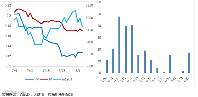 波动率为期权定价的关键因素,更是衡量期权价格高/低估的唯一指标。我们综合比较其和历史波动率的大小来预估商品期权定价。通过对豆粕主力近一年的历史波动率统计,其20日的波动率均值和中值分别为17.15%和15.19%,截止8.3,豆粕主力的IV和HV20分别为17.01%和12.7%,相比前周,HV和IV持平。料短期内豆粕波动率继续维持低位,做空波动率较为有利。