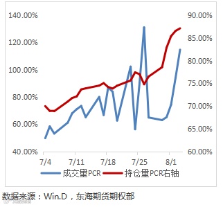 我们通常通过分析成交量和持仓量的PCR(看跌期权与看涨期权的比值)来衡量当前市场的情绪。上周成交量PCR和持仓量PCR重心均有所上升,市场情绪稳中较多。