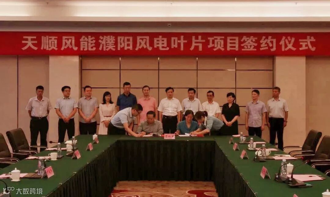 8月6日,濮阳人民政府与天顺风能(苏州)股份有限公司就天顺风能(濮阳)风电叶片项目达成一致,并隆重举行签约仪式。根据协议,天顺风能将在濮阳投资建设天顺风能(濮阳)风电叶片项目,计划总投资约5亿元。
