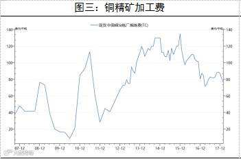 进口的增长伴随的是加工费的持续下行。据上海有色网统计,2018年2月进口铜精矿的粗炼费用为76美元/吨,较一月下降约4美元/吨;3月进口铜精矿价格粗炼费用继续走低,截至3月23日已下降至73.5美元/吨,接近6年来的新低。我们认为加工费的持续走低主要由两方面原因造成,一是国外铜精矿供应减缓,二是国内冶炼产能持续增加,预计在未来一段时间内,铜精矿加工费仍将进一步走低。