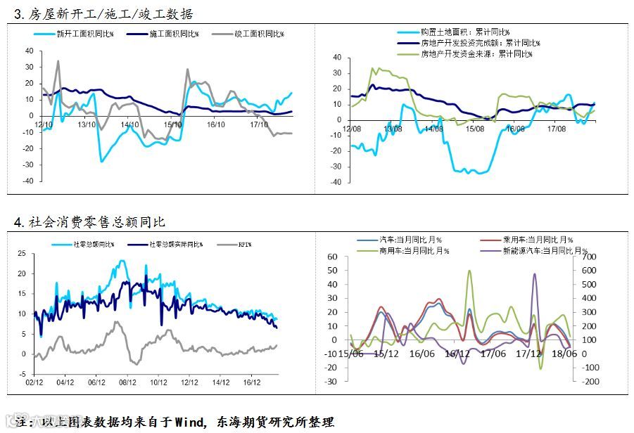 2、7月规模以上工业增加值同比6%,连续5个月不及市场预期,供需扩张压力渐显。分三大门类看,7月份,采矿业增加值同比增长1.3%,增速较6月份回落1.4个百分点;制造业增长6.2%,加快0.2个百分点;电力、热力、燃气及水生产和供应业增长9.0%,回落 0.2个百分点。7月煤炭、钢铁行业生产增速受环保督查影响量缩价涨,而工业机器人、集成电路等高端制造业增速也出现下滑。7月底六大发电集团日均耗煤量环比月初出现回落,并未出现持续上升的现象,高炉开工率等产能利用率指标也出现回落迹象,显示淡季叠加环保限产政策,工业生产边际回落。三季度生产释放将会面临需求不足的约束,可持续性或有限,供需缺口收窄将带动工业品价格下行。7月份政策层面的环保限产对生产端及大宗商品价格有较大的影响,8月份之后,环保攻坚战政策越发严格,监管措施进一步细化,区域范围也将进一步扩大,后续仍需持续关注。