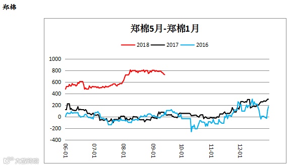 棉花跨期价差(CF1905– CF1901)高位震荡,未来行情有待观望。