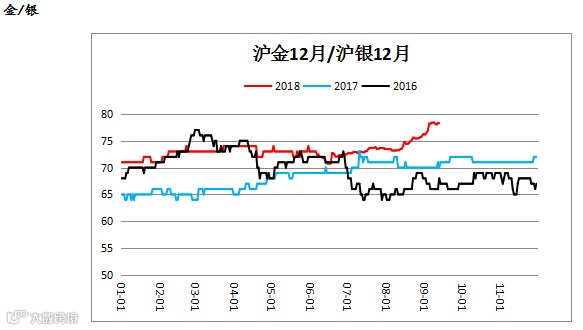 伦敦金银价比,沪金沪银价比(AU1812 / AG1812)震荡上行,未来行情有待观望。