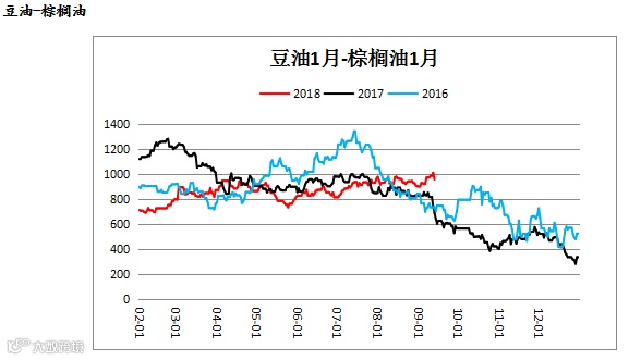 豆油棕榈油价差(Y1901– P1901)小幅震荡。