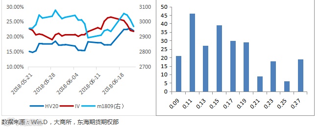 波动率为期权定价的关键因素,更是衡量期权价格高/低估的唯一指标。我们综合比较其和历史波动率的大小来预估商品期权定价。通过对豆粕主力近一年的历史波动率统计,其20日的波动率均值和中值分别为15.2%和14.2%,截止6.22,豆粕主力的IV和HV20分别为21.77%和22%,相比前周,IV下降,HV上升,二者开始收敛。预期未来隐波率维持震荡或震荡走低的概率较大。