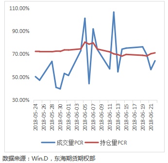 一般经验认为缴纳保证金的期权卖方属于资金优势者,通过分析卖方的持仓行权价来分析大资金者倾向认为的压力位和支撑位。截止上周6.22,豆粕期权合约的成交量集中看涨看跌的虚值一到三档,持仓量分布较为均匀,看涨期权多集中在3000-3200之间,看跌期权集中在3000。可以看出,市场比较认可的支撑和压力位置在分别在3000和3100附近。