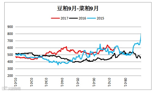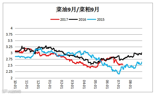 菜油棕榈油价差(OI1809 – P1809),菜油豆油(OI1809 – Y1809)价差震荡下行,建议观望。