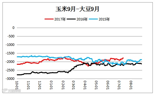玉米大豆价差(C09M-A09M)小幅震荡上行,建议观望。