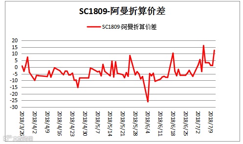 上期所SC1809收盘价与阿曼原油价差震荡上行。