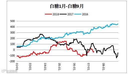 白糖跨期价差(SR1901– SR1809)震荡下行,建议观望。