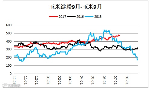 玉米淀粉玉米价差(CS1809 – C1809)震荡上行。