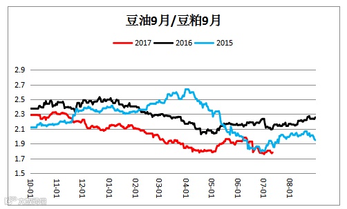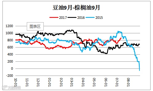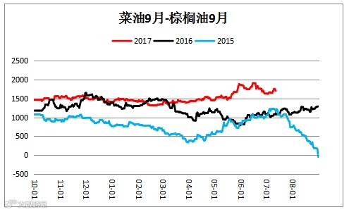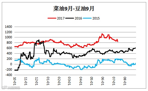 豆油棕榈油价差(Y1809– P1809)震荡上行,可适当逢低进行多豆空棕的套利操作。