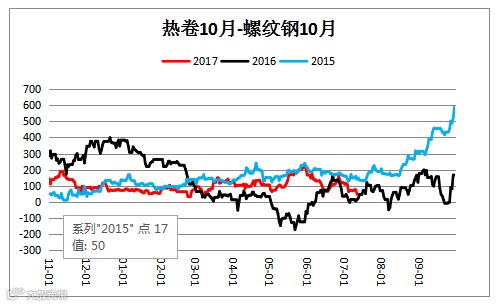 热卷螺纹钢价差(HC1810 – RB1810)震荡下行,建议观望。