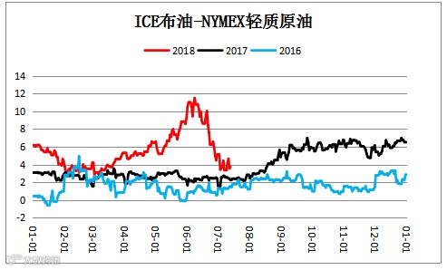 ICE布油与NYMEX轻质原油价差震荡下行。