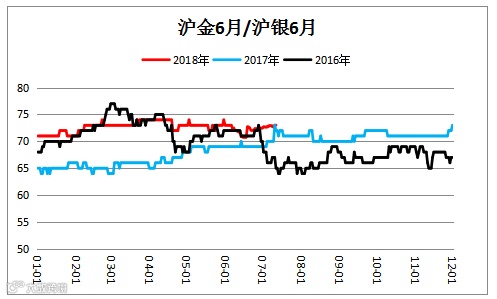 伦敦金银价比,沪金沪银价比(AU1806 / AG1806)区间震荡,未来行情有待观望。