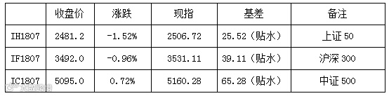期指成交持仓方面,IH1807总手15805手,持仓16509手;IC1807总手14010手,持仓24921手;IF1807总手23463手,持仓31242手。