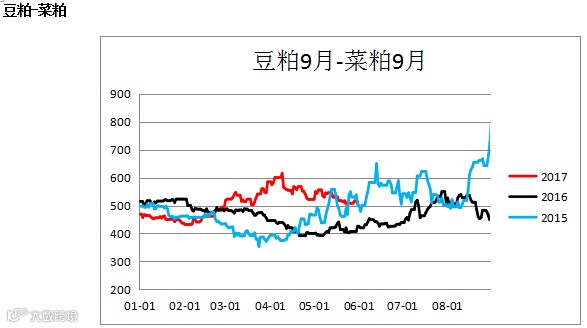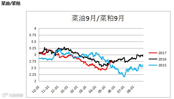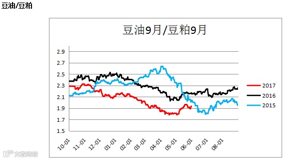 油粕比(Y1809/ M1809, OI1809 / RM1809)震荡上行,建议关注买粕抛油的套利操作。