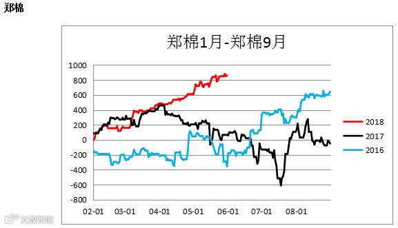 棉花跨期价差(CF1901– CF1809)震荡上行,未来行情有待观望。