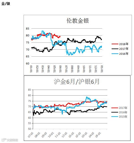伦敦金银价比,沪金沪银价比(AU1806 / AG1806)区间震荡,未来行情有待观望。