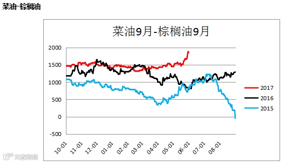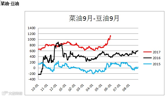 菜油棕榈油价差(OI1809 – P1809),菜油豆油(OI1809 – Y1809)价差震荡上行,建议观望。