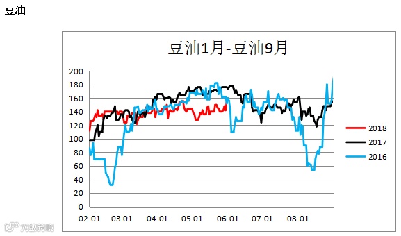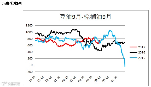 豆油棕榈油价差(Y1809– P1809)大幅震荡,可适当逢低进行多豆空棕的套利操作。