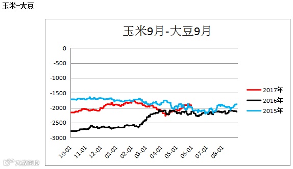 玉米大豆价差(C09M-A09M)震荡上行,建议观望。