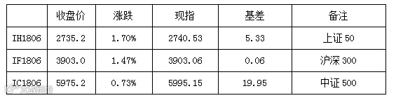 上周五,三大股指均一定幅度反弹,其中IC收涨0.73%,IF收涨1.47%,IH收涨1.70%,表现偏强。期现价差方面,按收盘价计,之前小幅升水IC1806贴水20点左右,之前小幅贴水的IF1806基本保持平水,IH1806贴水扩大至5点左右。现指方面,受布油再创阶段新高刺激,石油产业链各板块全面爆发,南方高温天气促用电量走高,煤炭板块表现抢眼;暂停受理“赛马”等字样登记申请,海南板块仍然持续火热;环保、知识产权板块午后一度冲高;金融股全面回暖;电子行业表现不佳。持仓方面,IF增持5000手左右,IC增持3600手左右,IH增持3500手左右。