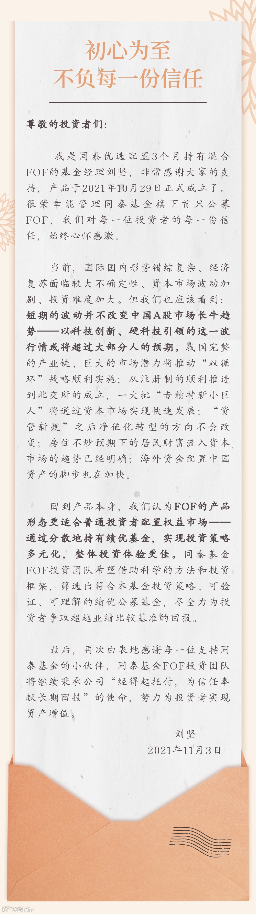 同泰优选配置3个月持有混合(FOF)于2021年10月29日正式成立了。我们对每一位投资者的每一份信任,始终心怀感激。