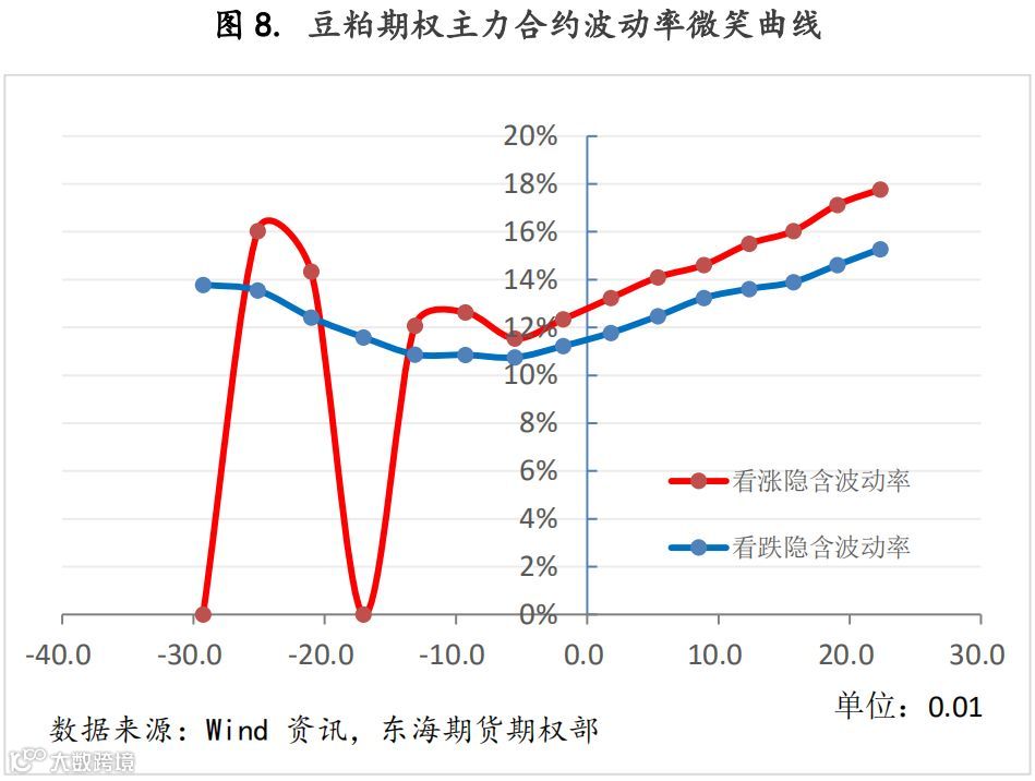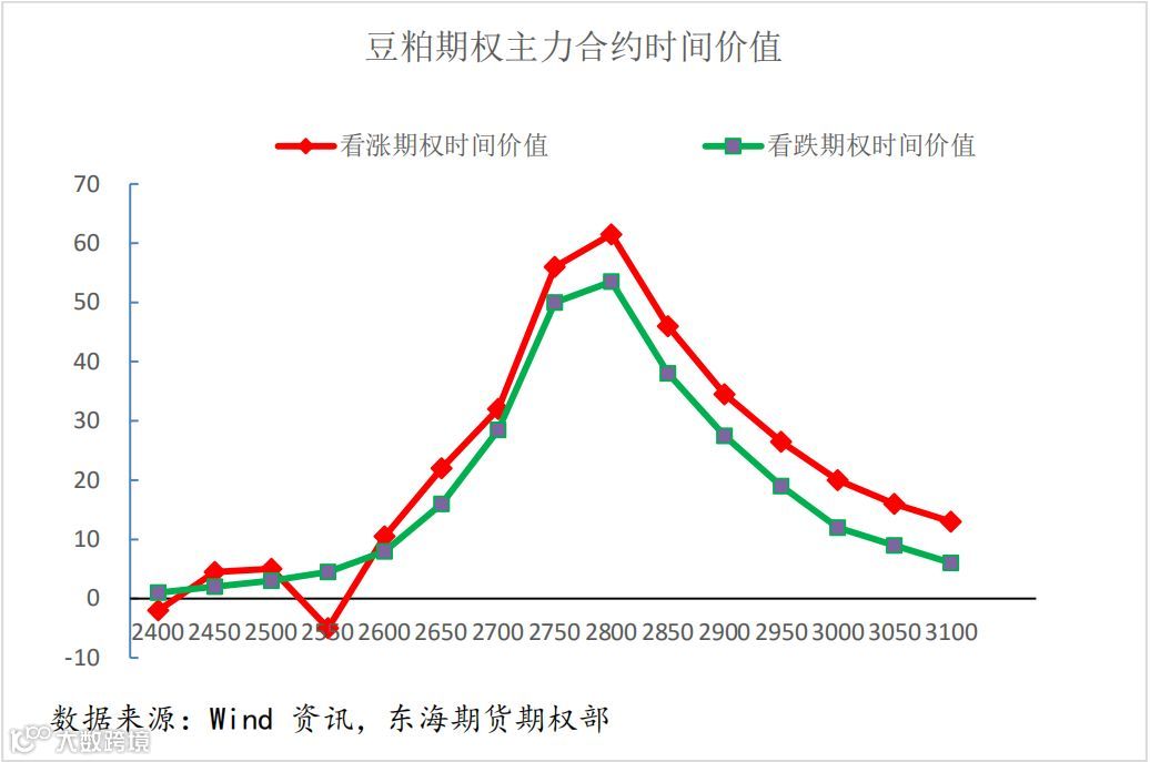 上周,主力月份的豆粕期权波动率微笑如下图所示。看涨期权隐含波动率曲线整体处于看跌期权上方,期权市场对豆粕期货上涨的预期高于下跌。执行价为 2400、2550 的看涨期权时间价值为负,被低估。