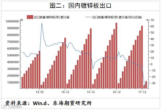 消费端,据中国钢铁工业协会统计,3月我国镀锌板库存较2月大幅增加8.77万吨;而据我的有色网统计,截至4月20日,镀锌社会库存为100.64万吨,较上周明显下滑;目前镀锌产能利用率73.93%,较二月的70.13%有明显提升。与此同时,数据显示国内镀锌板带出口数据明显走弱,据国家统计局数据显示,2018年2月,中国出口镀锌板带57.55万吨;2018年1-2月,中国累计出口镀锌板带115.75万吨,较去年同期减少约46万吨,同比下降28.45%。