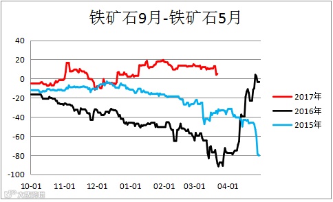 铁矿石跨期价差(I1809 – I1805)震荡,建议观望。