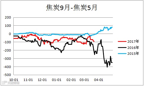 焦煤跨期价差(JM1809 – JM1805)震荡偏弱,焦炭跨期价差(J1809 – J1805)震荡,建议观望。