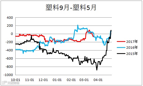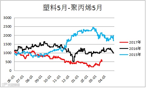 塑料聚丙烯价差(L1805– PP1805)震荡上行,未来行情有待观望。