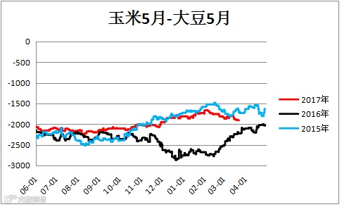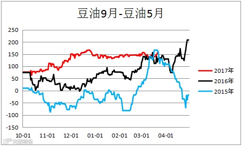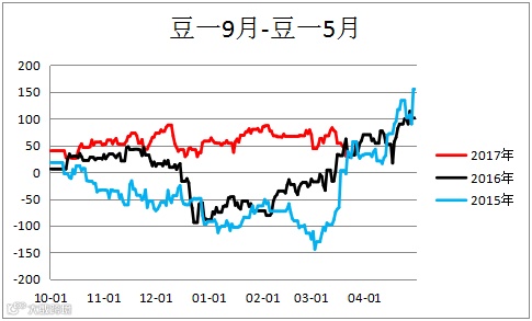 大豆跨期价差(A1809– A1805)震荡偏弱。