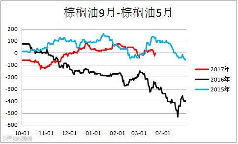 棕榈油跨期价差(P1809 – P1805)区间震荡。豆油跨期价差(Y1809– Y1805)小幅上行。